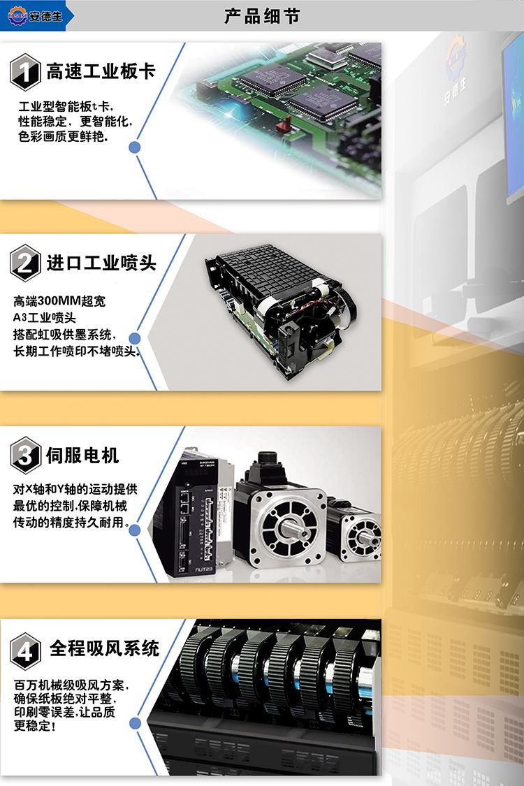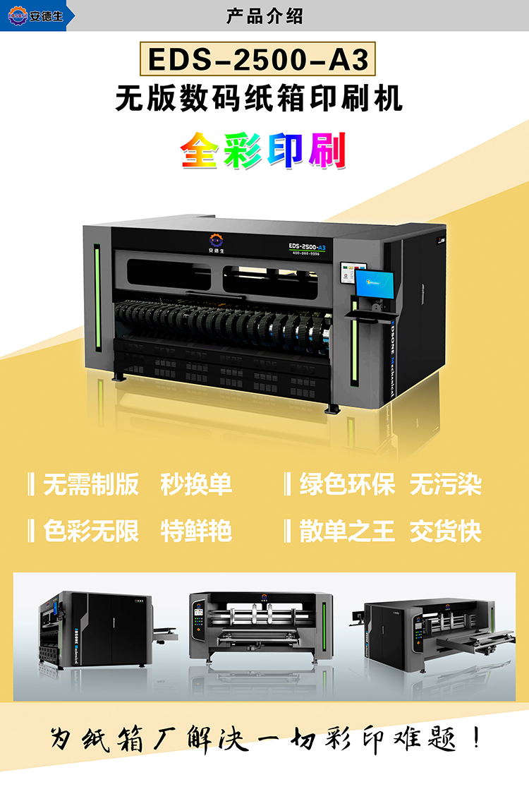 此款EDS-2500无版数码纸箱印刷设备是一款高精度固定式直出纸箱纸板打印机,可配备4-7个喷头,实现最高为1200*1200 DPI的高精度输出以满足客户生产需求;打印最大宽幅为1200-2100mm,单头可打印宽300mm、长度为无限长的产品。文档图片格式无限制。实现0秒换单,无需制版,色彩无限制,一张起印,数码彩印天花板级固定式纸箱印刷机。